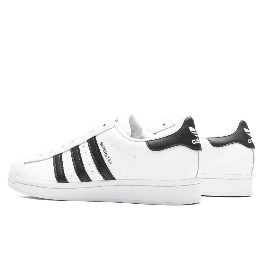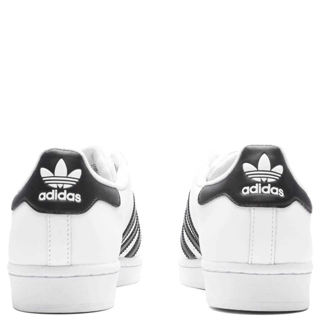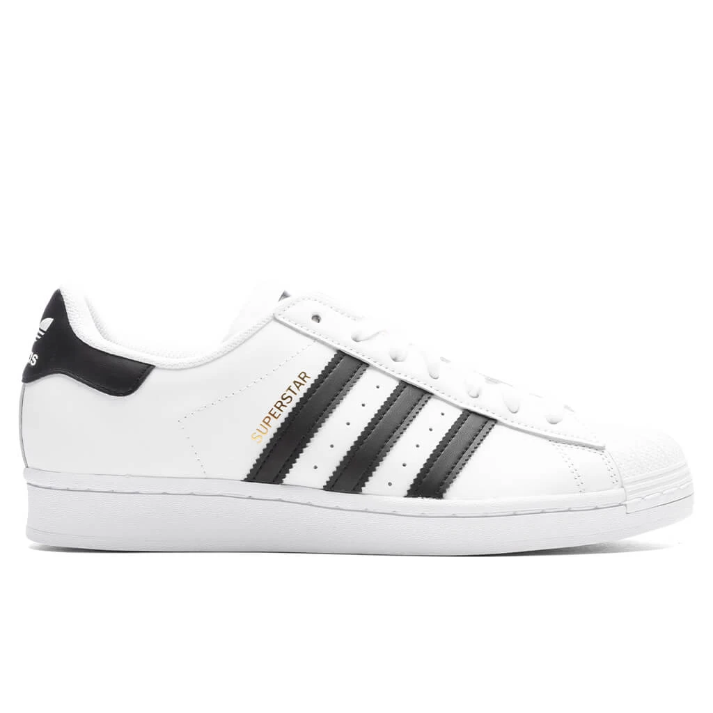 Classic and timeless aesthetics are present within the Adidas Superstar. This modern design is showcased within its full-grain leather upper, accented with black leather Three Stripe branding. The rubber shell-toe is showcased along with the leather heel tab inscribed with the Adidas Trefoil. Additional branding can be seen at the tongue and quarter panels accented in shiny gold foil. The rubber outsole offers optimal durability.