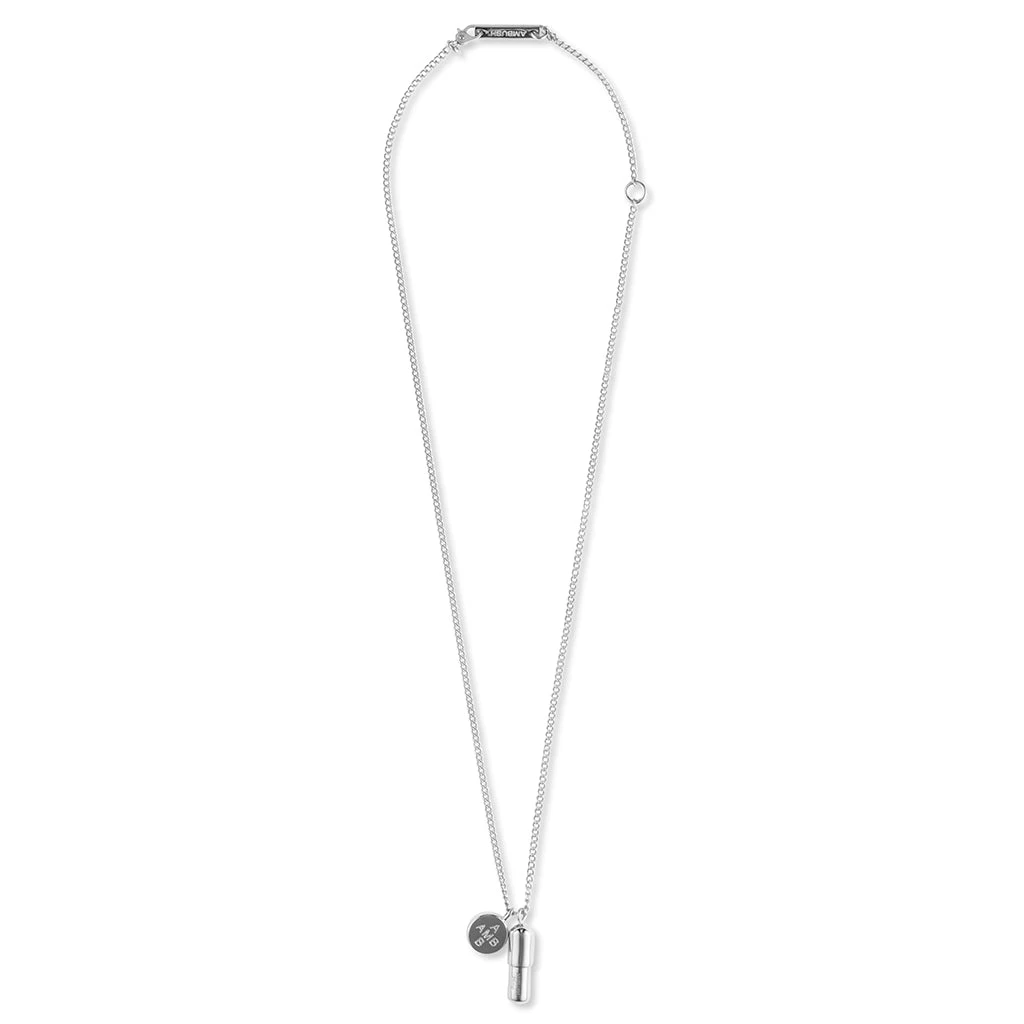 The Pill Charm Necklace is an easily paired design that can accessorize any outfit. Constructed with premium silver, the necklace is adjustable and can be tailored to your desired style. Engraved branding makes its way upon the charm, completing its design.Â