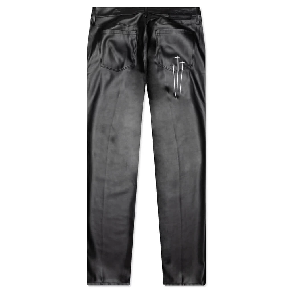 Upgrade your streetwear apparel rotation with the RtA Bryant Pant. Composed of polyurethane and polyester, the pant takes on a skinny vegan leather aesthetic. An embroidered motif can be seen across the left leg and a triple cross at the rear.Â