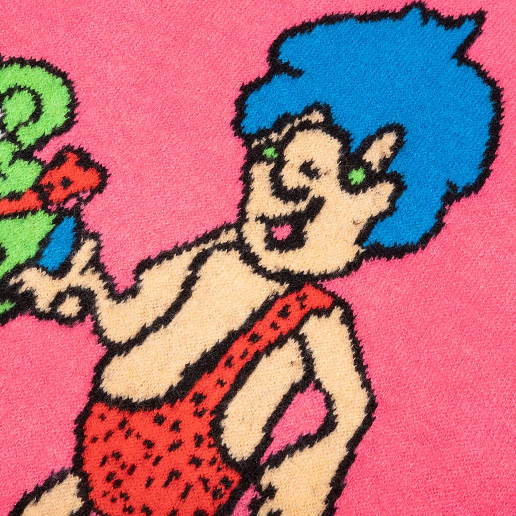 The Buddies Sweater from Brain Dead is an essential streetwear apparel item for transitioning into unpredictable weather. Featuring a blend of acrylic, nylon, wool, and spandex, the silhouette spotlights ribbed detailing at the neckline, cuffs, and hem. Stitched branding is placed and intertwined with graphics of a caveman feeding a frog.