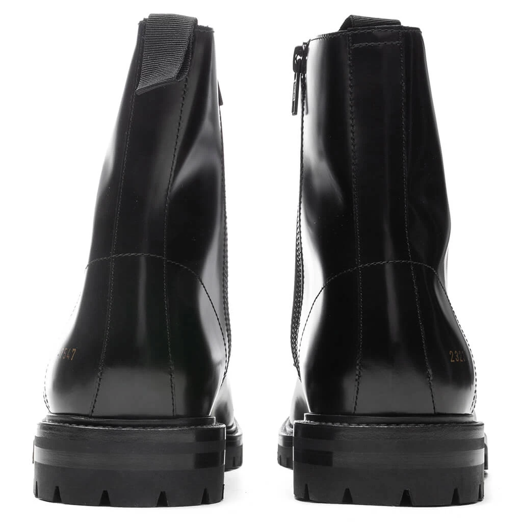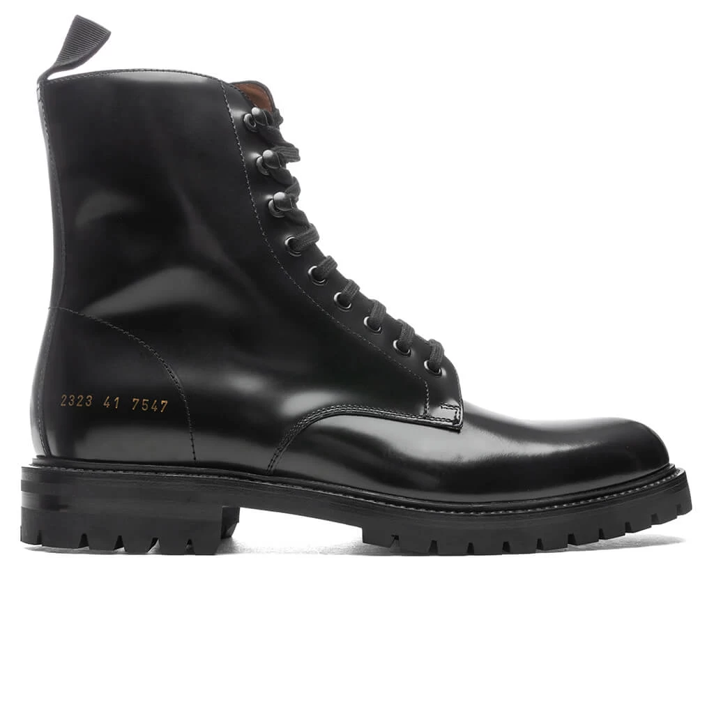 Common Projects expand their footwear collection with their take on the classic Combat Boot. Designed with premium calf leather, the smooth design includes a grosgrain heel pull tab, woven laces, and Common Project’s signature gold foil branding. Its Italian design is then completed with a crepe sole and leather lining.