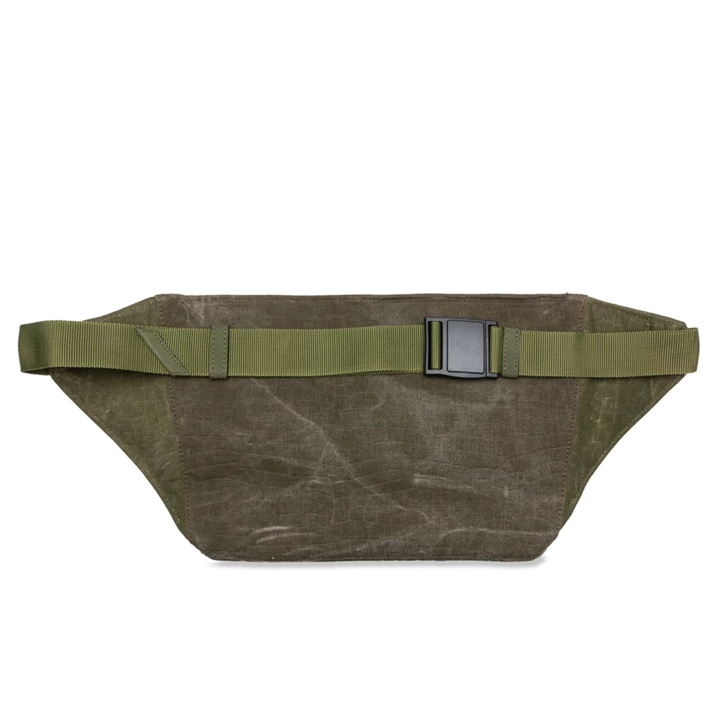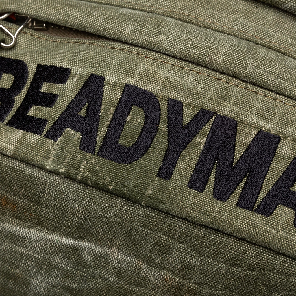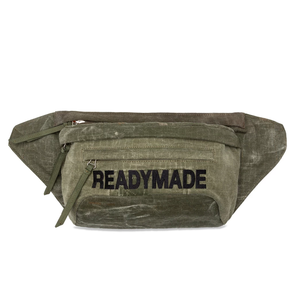 READYMADE was created in 2013 as the vision of designer Yuta Hosokawa. The brand’s theme was world peace. By upcycling military materials, Hosokawa thought turning items used for violence and death into items for pleasure would convey his wish for an end to all war. Pictured is the ReadyMade Embossed Logo Belt Bag in Green.