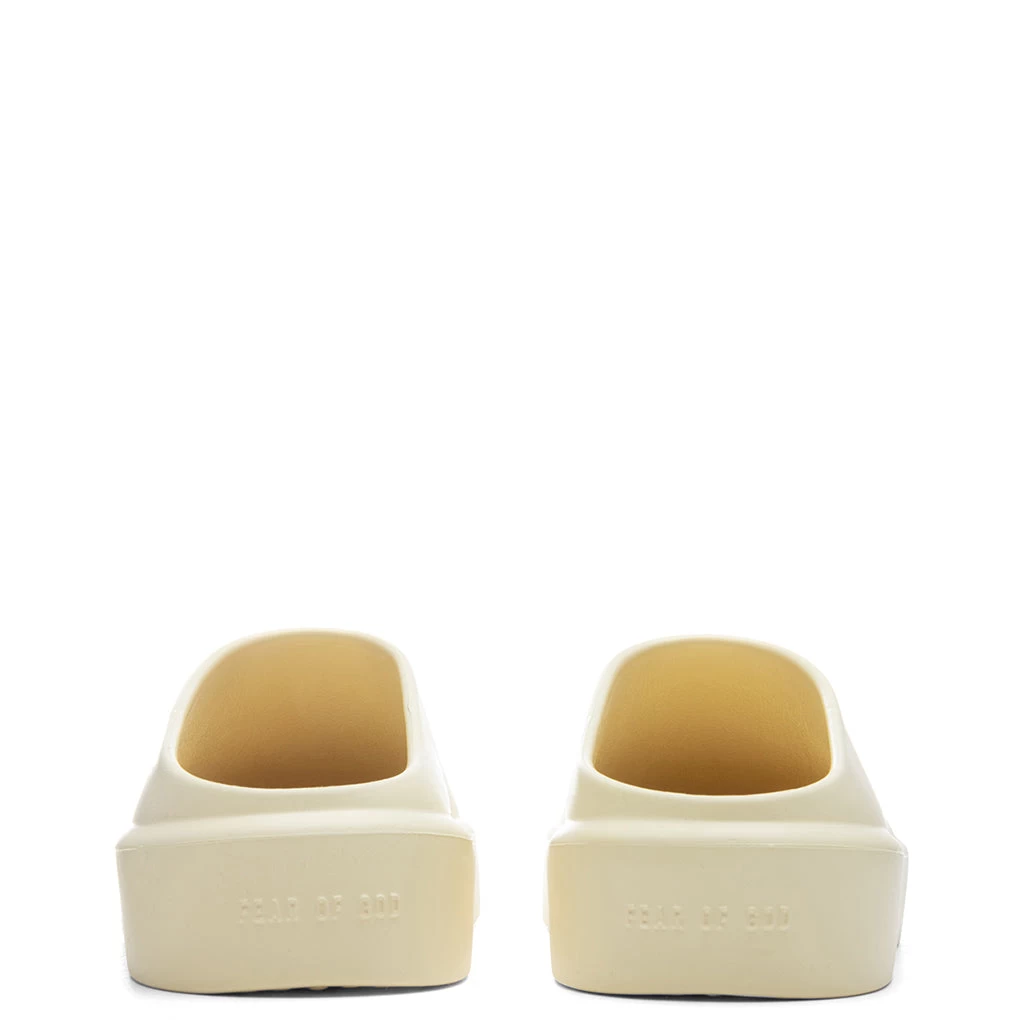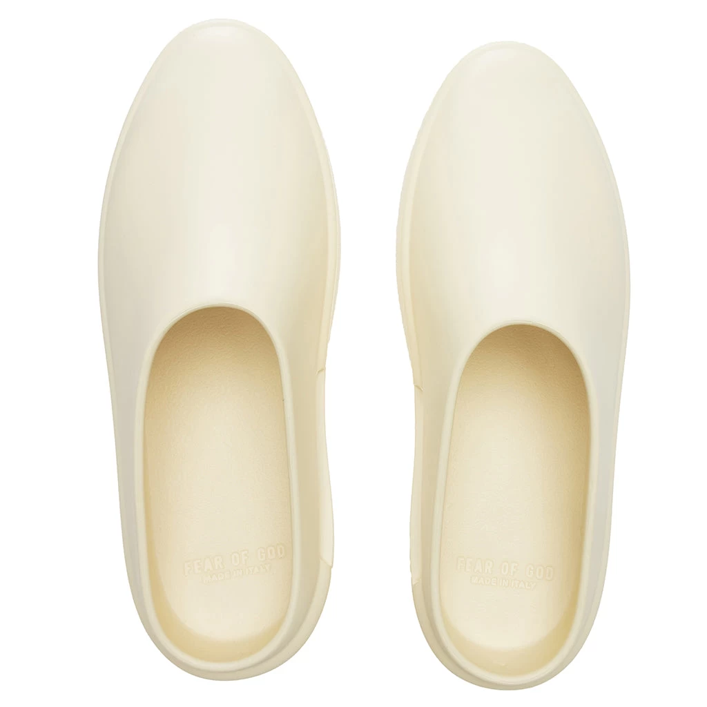 The Luxury Los Angeles-based label Fear of God introduces The California. Made entirely from innovative foam rubber produced in Italy from patented XL Extralight Technology. The Extrabounce compound is light and allows for greater flexibility, comfort, and durability. Backless and made for a slip-on design, the sculptural aesthetic emphasizes functionality by incorporating an inner vent to provide maximum airflow, while the raised tread provides optimal traction and durability. Fear of God branding at the heel ties together the sleek aesthetic.