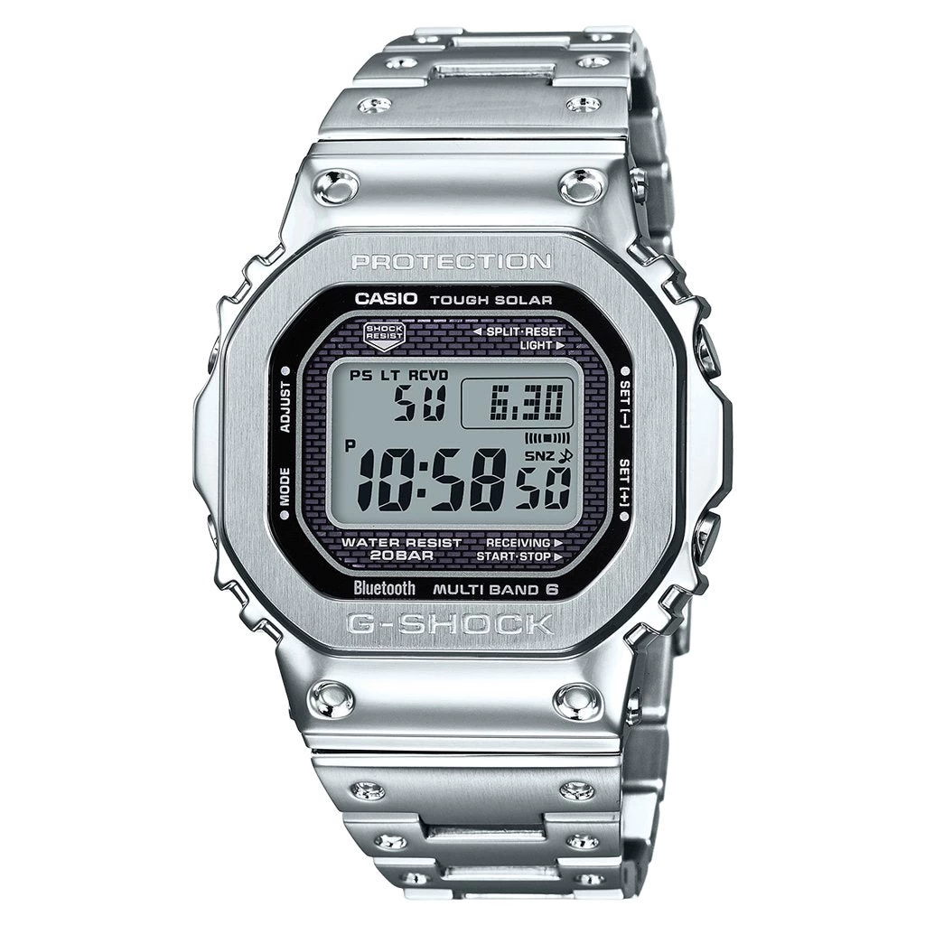 G-Shock continues its high-quality craftsmanship with the Full Metal 5000. With an iconic square face, the silhouette features a stainless steel case for optimal protection. The sophisticated and original design features a stainless steel band and mineral glass protection while also incorporating Bluetooth connectivity throughout the silhouette. Shock and water-resistant, the design is complete with a 22-month rechargeable battery.