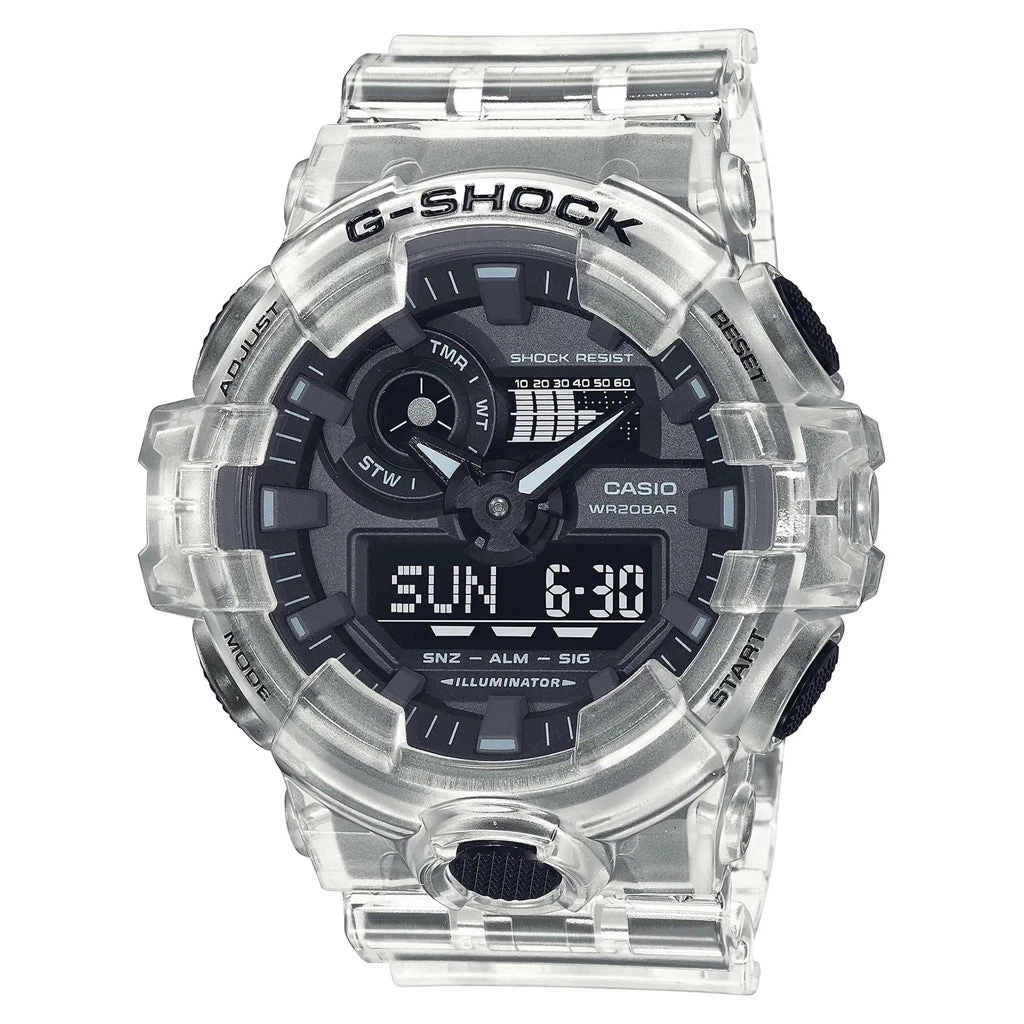 The GA700SKE-7A Model is introduced in a new series that highlights transparent resin within its construction. The digital-analog design is protected with mineral glass while resin constructs the bezels and band. G-SHOCK core technology is implemented within its design emphasizing its industrial features.Â