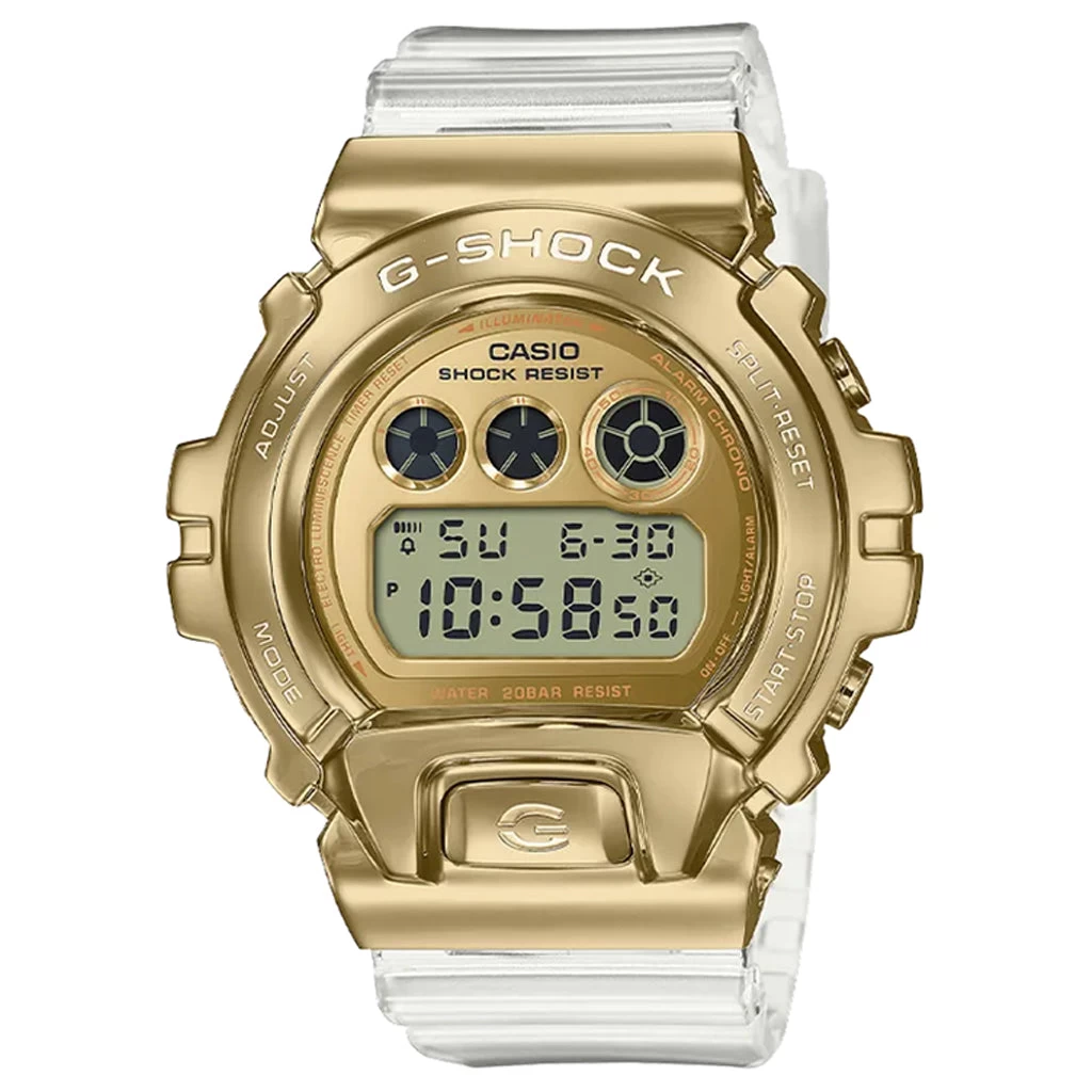 Making its introduction within the Metal Covered lineup, the GM6900 Series is seen with stainless steel bezels and is inspired by the gold ingot motif. The round base is accented with inset dials and stainless steel bezels for an industrial finish. A resin band contrasts the design while varying attributes contribute to its tough design.Â