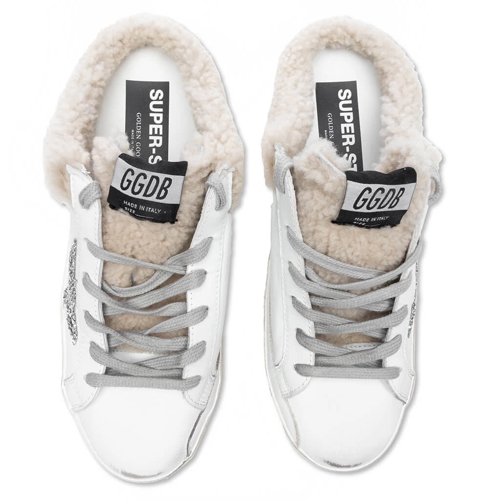 Embody comfort with elevation with the Golden Goose Women’s Super-Star Sabot. Featuring a leather upper, the slip-on sneaker features a glitter toe as well as a lace fastening. A logged tab is placed at the tongue, while the iconic Suede Star at the side panel and the side contrasting color logo further accentuate the elevated design. A shearling interior offers comfort and warmth, while the all-over vintage effect and intentional scuffing and rubber outsole complete the look.