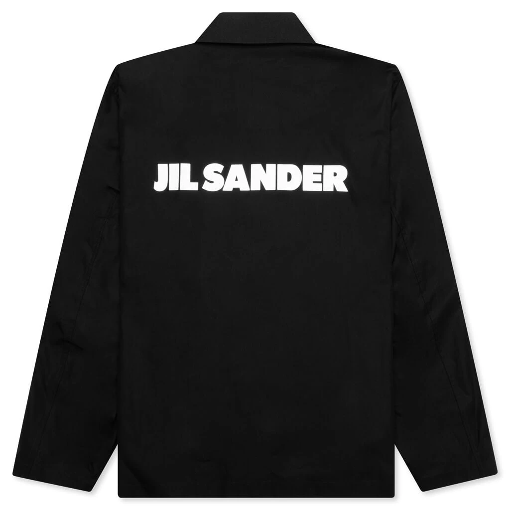 Introducing the Jil Sander Logo Print Shirt Jacket in versatile black, a testament to minimalist design and purposeful detailing. The crisp, contrasting logo print at the rear adds a contemporary edge, while maintaining a timeless aesthetic. Crafted with a mid-weight non-stretch fabric, this jacket is as durable as it is stylish. Its loose fit allows for comfortable movement, making it a versatile addition to any wardrobe.