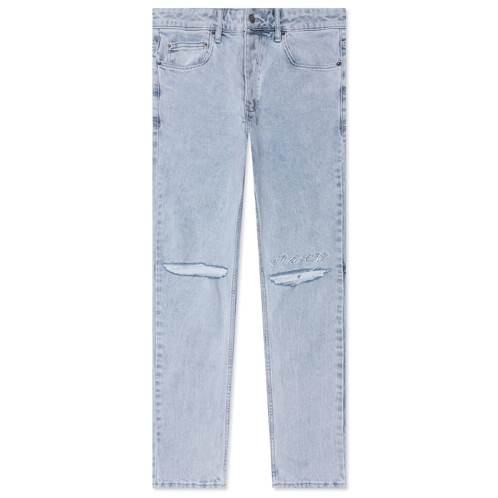 Ksubi introduces the Chitch Super Cold. Cut from cotton and elastane, the silhouette utilizes a slim fit and a five-pocket design. Distressing can be found on the knees, while embroidery above the left knee makes a statement. A signature Ksubi hang tag makes a statement, wrapping up the remainder of the look.