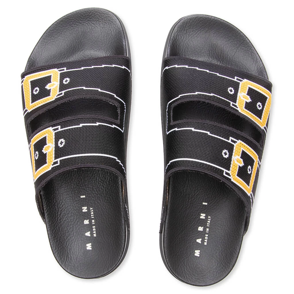 Marni’s elevated aesthetics are present in their take on the sandal. Featuring a black knitted fabric at the dual strap, embroidered branding resides at the side along with additional detailing. The anatomically molded rubber footbed is treated with additional branding, while the treaded rubber outsole underneath finishes the rest of the look.