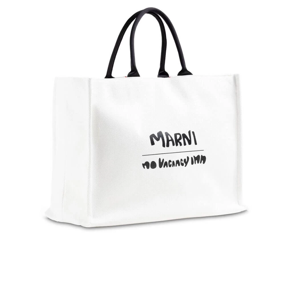 The Marni x No Vacancy Inn Bey Tote Bag makes an impression with its premium aesthetic. The accessory utilizes a double leather handle as well as a canvas construction. Jacquard tape shoulder straps are placed, while the leather loop closure, fabric lining, and internal zip pocket offer further dimension. The embossed Marni logo and printed Marni No Vacancy Inn logo complete the remainder of the design.