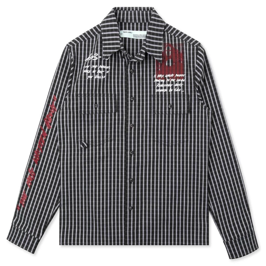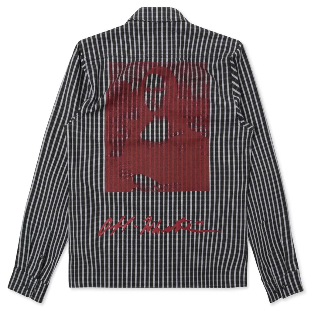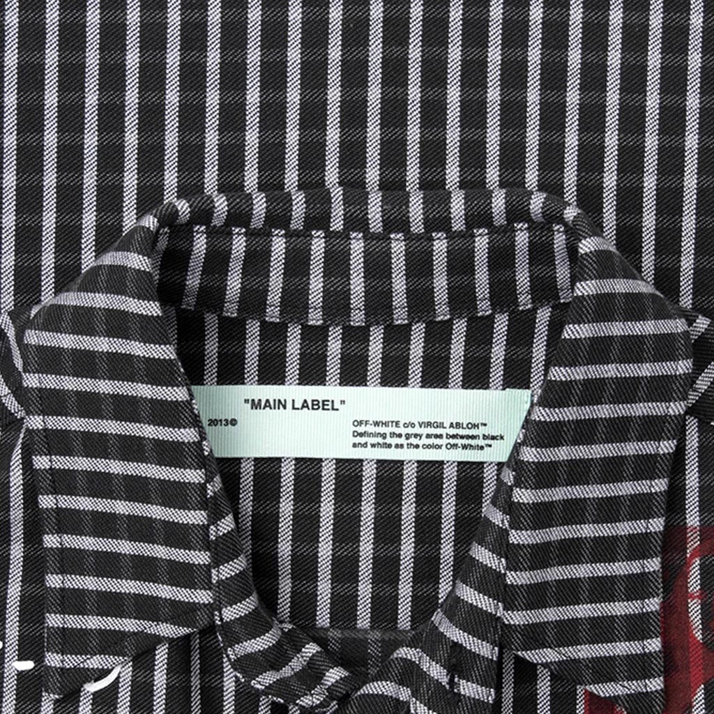 Off-White c/o Virgil Abloh is a fashion label rooted in current culture at a taste-level particular to now. Manufacturing is based in Milan with a core value of the brand to be made from the best available and particular opinion regarding fabric, fit and fabrication. Pictured is the Off-White c/o Virgil Abloh Mona Lisa Classic Striped Shirt in Black/Red.