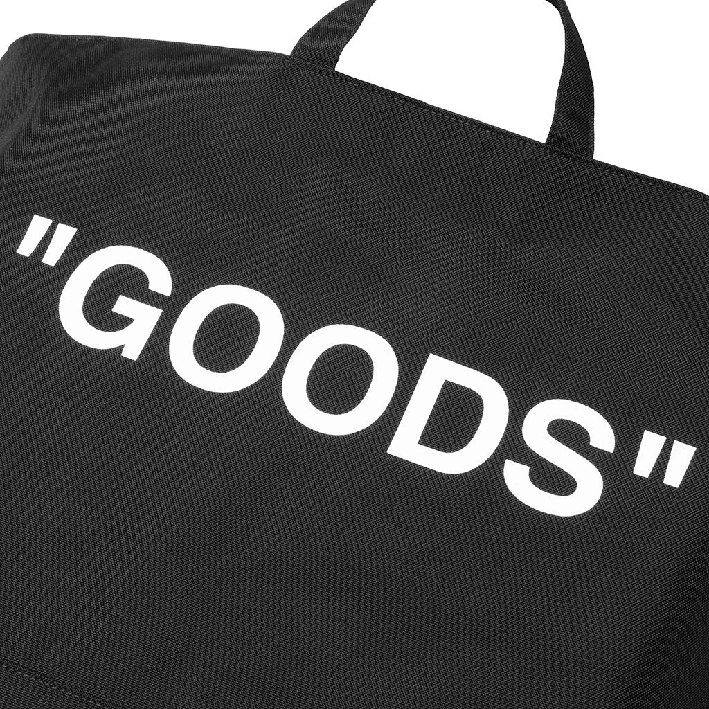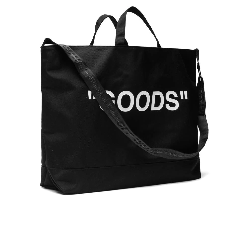 The well-known brand, Off White ℅ Virgil Abloh, continues to rise in popularity from season to season and continues to “define the grey area between black and white.” Off White ℅ Virgil Abloh has surpassed expectations and created a high-end fashion label that appeals to both streetwear consumers and those looking for progressive design. The brand focuses on high-end fabrics but in familiar streetwear shapes while using plain labels and industrial packaging. Pictured is the Off-White c/o Virgil Abloh Quote Tote Bag in Black/White.