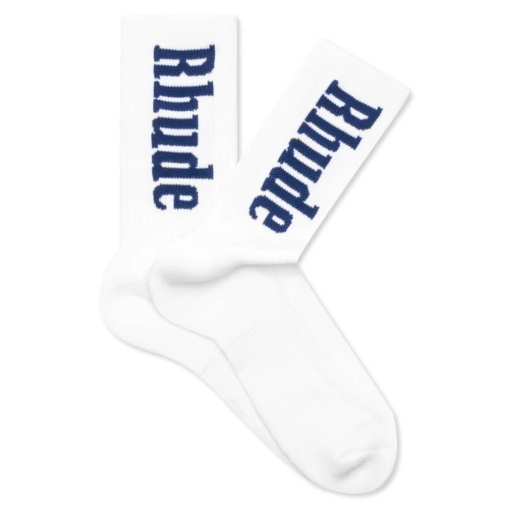 Add a premium accessory into your rotation with the Rhude Logo Verticle Sock. Composed of a blend of cotton, nylon, polyester, and spandex, the design features stitched branding at the ankle. The ribbed detailing finishes the look.