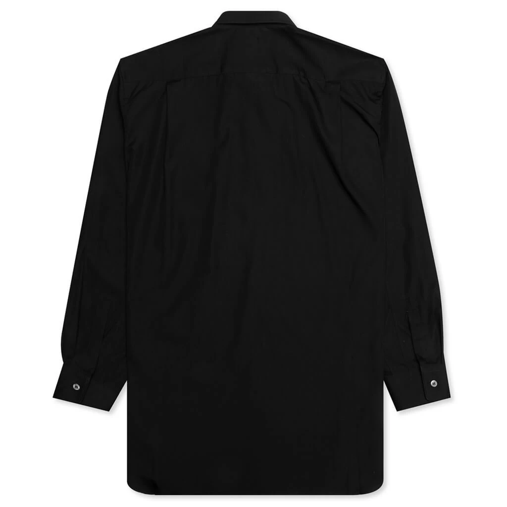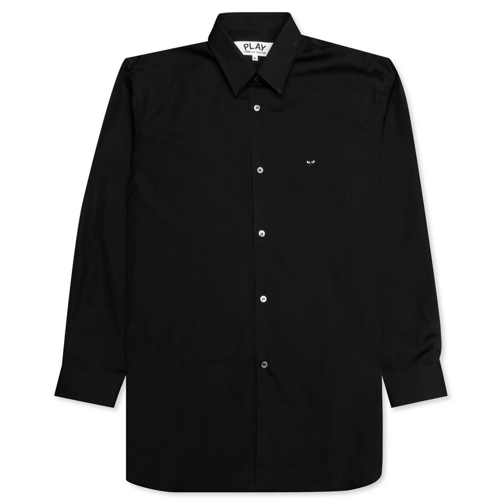 The concept of the Comme des Garcons PLAY line is design by not designing.  Characterized by the iconic red heart logo designed by artist Filip Pagowski, the line is a collection of unisex basics, fragrances, and footwear for those who enjoy simplicity.  Pictured is the Comme des Garcons PLAY Small Black Emblem Button Down in Black.              AZ B014 051 1