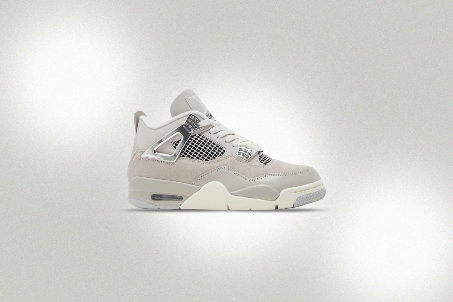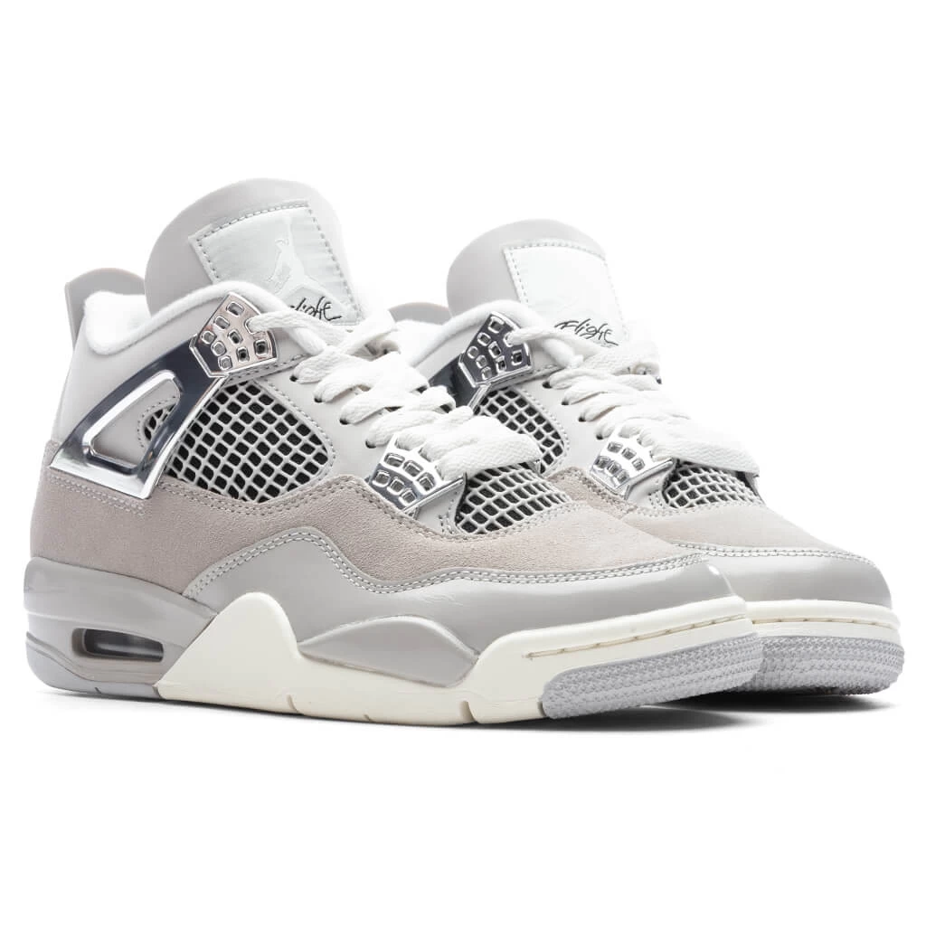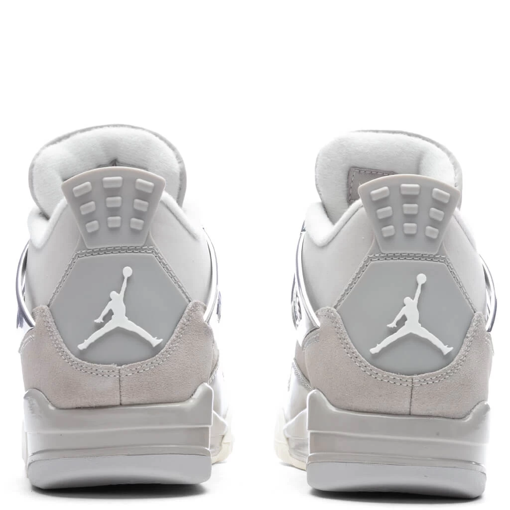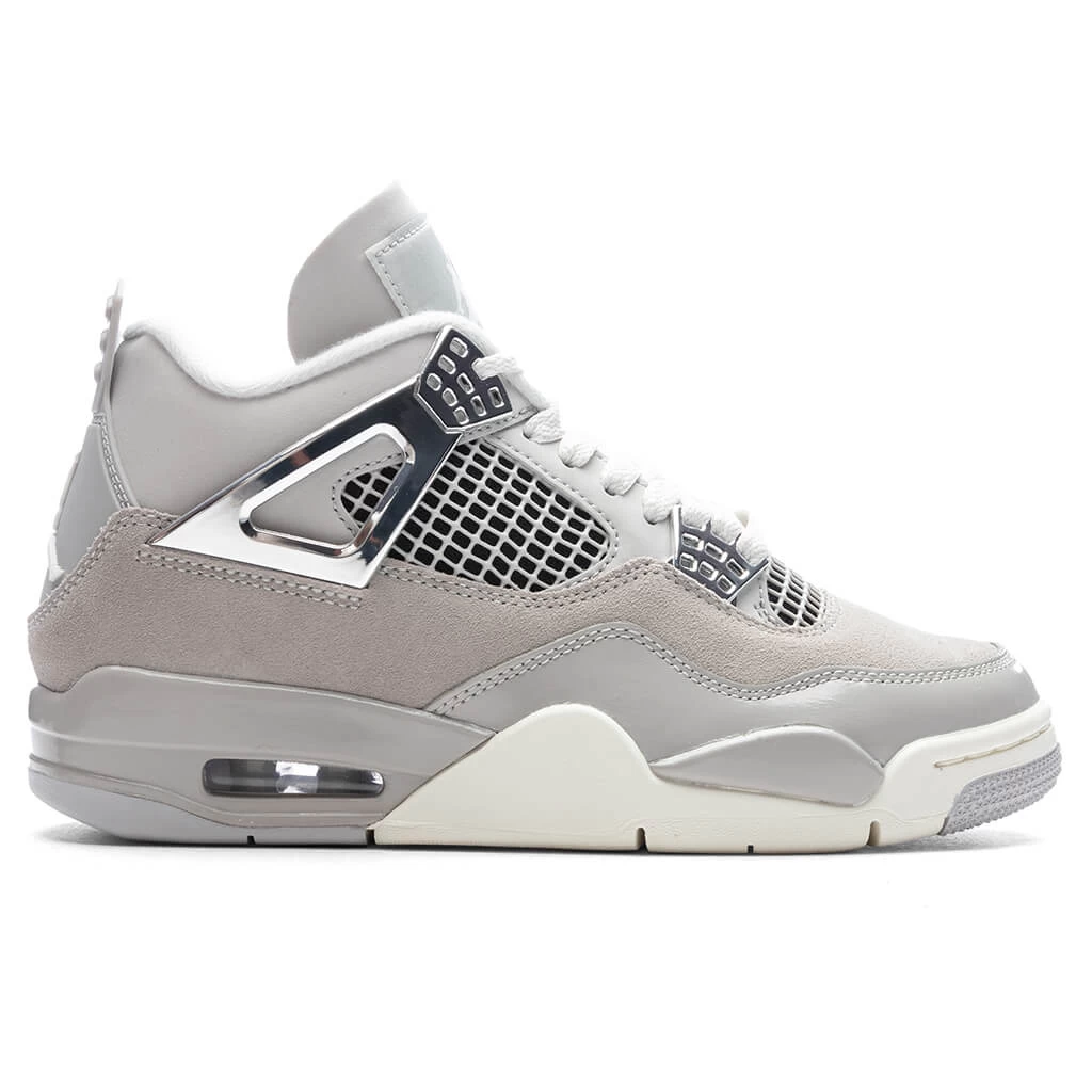 The Air Jordan 4 Retro Women’s ‘Frozen Moments’ makes an impression with its suede upper and color-matched forefoot overlays in glossy leather. Breathable netting at the throat and quarter panel paired with the molded eyelets makes an impression. The support wings and molded eyelets are treated with a metallic silver finish. Tonal Jumpman branding is embellished at the tongue and molded heel tab. The foam midsole, visible Air-sole cushioning, and rubber outsole underneath finish up the rest of the look.