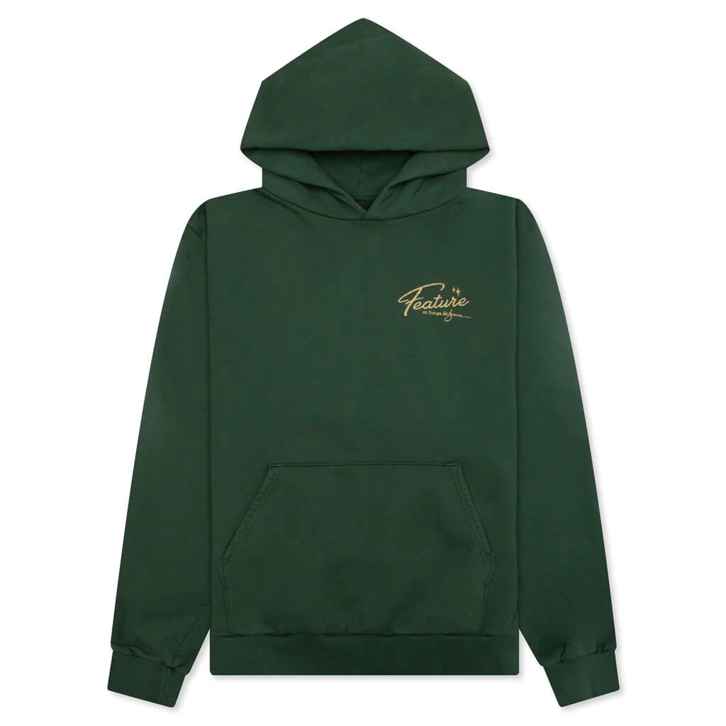 The FEATURE Wynn Shine Hoodie is another addition to the FEATURE Wynn Capsule. In 2018 the second FEATURE brick-and-mortar location made its grand debut at the Wynn Plaza Shops inside the Wynn Resort and Casino. This distinct silhouette is inspired by this location and Las Vegas iconography, as it spotlights screen-printed FEATURE branding at the chest and rear, both of which are intertwined with the phrase ‘All Things Wynn’ and star graphics. This phrase is inspired by our ‘All Things Good’ mantra. The hoodie is crafted from authentic 14 oz heavy weight 475 GSM cotton, resulting in its elevated aesthetic. Made domestically, the design has an oversized fit. Ribbed cuffs and hem are placed, while the kangaroo pocket embodies a functional touch.